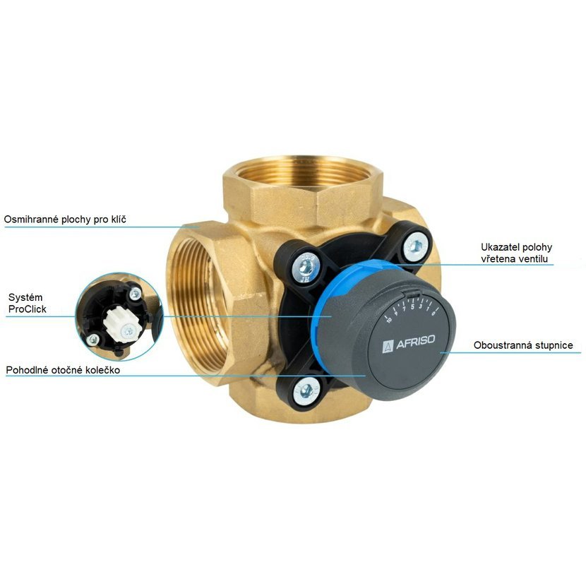 Čtyřcestný směšovací ventil je vhodný pro duální směšování. Jsou vhodné pro zvýšení teploty zpátečky do kotle, aby se zabránilo například poškození korozí. Směšovací ventily lze snadno automatizovat pomocí pohonů AFRISO. Nový adaptérový systém AFRISO ProClick umožňuje bezproblémovou montáž motoru na směšovací ventil bez použití nářadí. Nízký točivý moment zajišťuje nízké zatížení a dlouhou životnost.