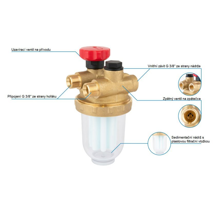 Dvourubkový olejový filtr Z 500 Si je určen pro instalace s lehkým topným olejem nebo motorovou naftou. Instaluje se mezi olejovou nádrž a hořák a slouží k odstranění pevných nečistot, které by mohly negativně ovlivnit provoz zařízení. Filtr má mosazné tělo, průhledný odstojník pro snadnou kontrolu a vyměnitelnou plastovou filtrační vložku. Je vybaven uzavíracím ventilem na přívodu a zpětným ventilem na zpátečce. Součástí balení jsou i nasouvací spojky a montážní držák.